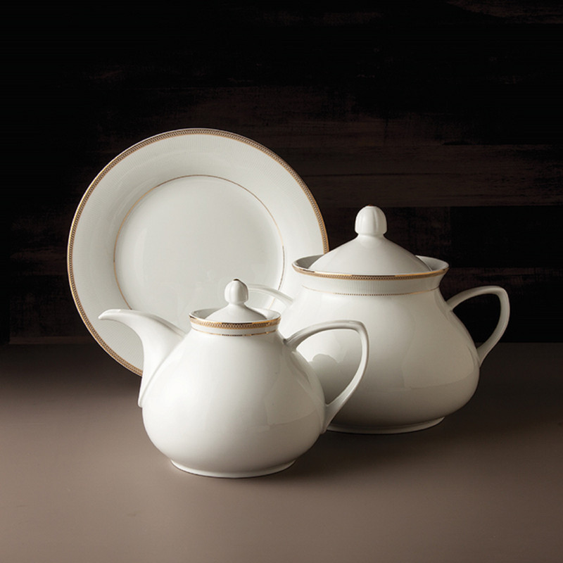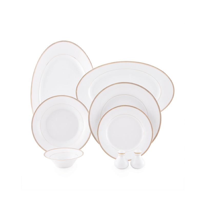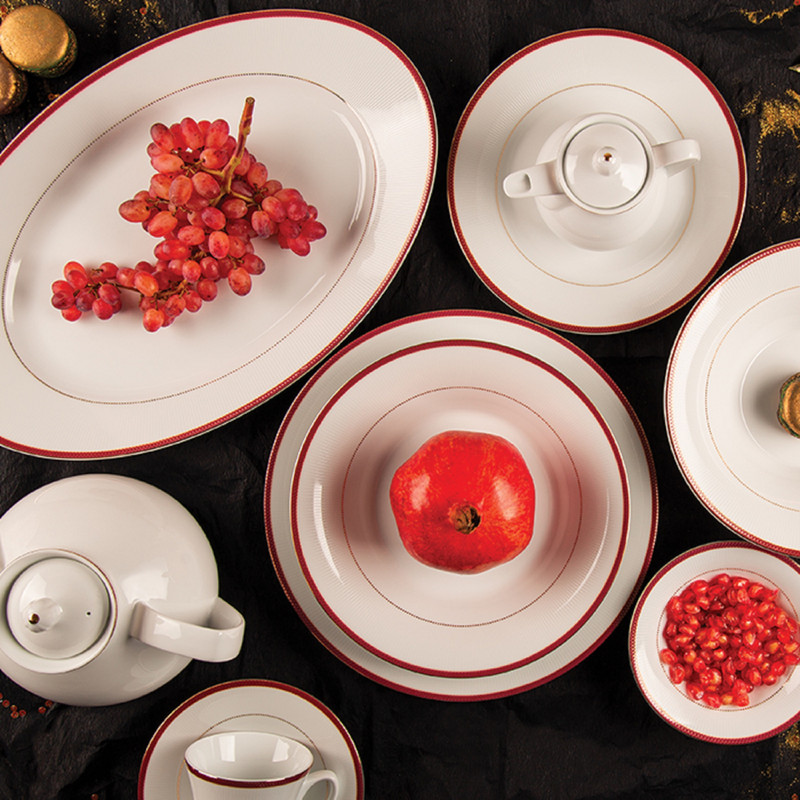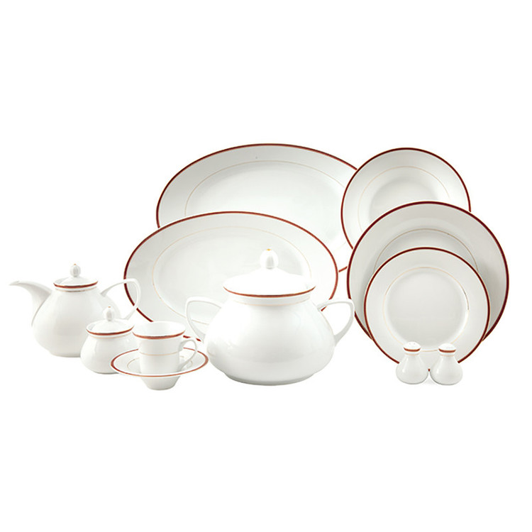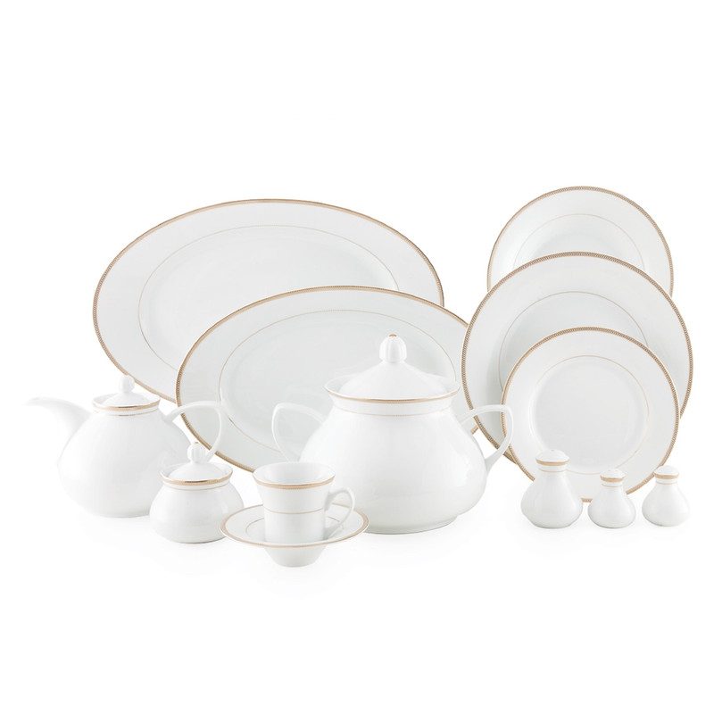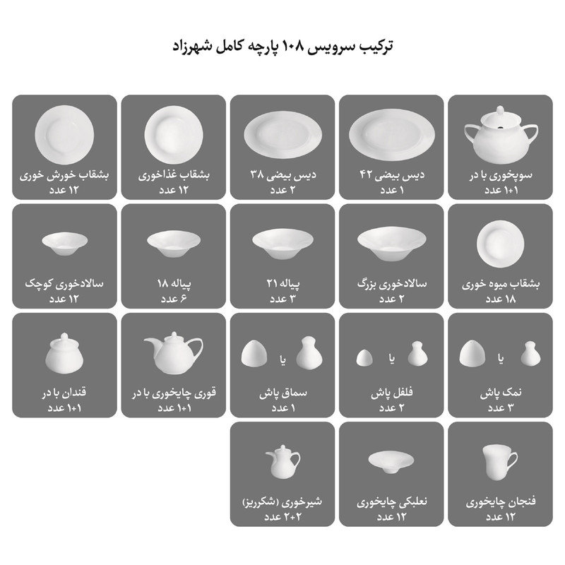 اقلام سرویس: سوپخوری , دیس , بشقاب غذاخوری , بشقاب خورشخوری , پیشدستی , سالادخوری , پیاله , نمکپاش و فلفلپاش , قندان , قوری چایخوری , فنجان , نعلبکی , شیرخوری