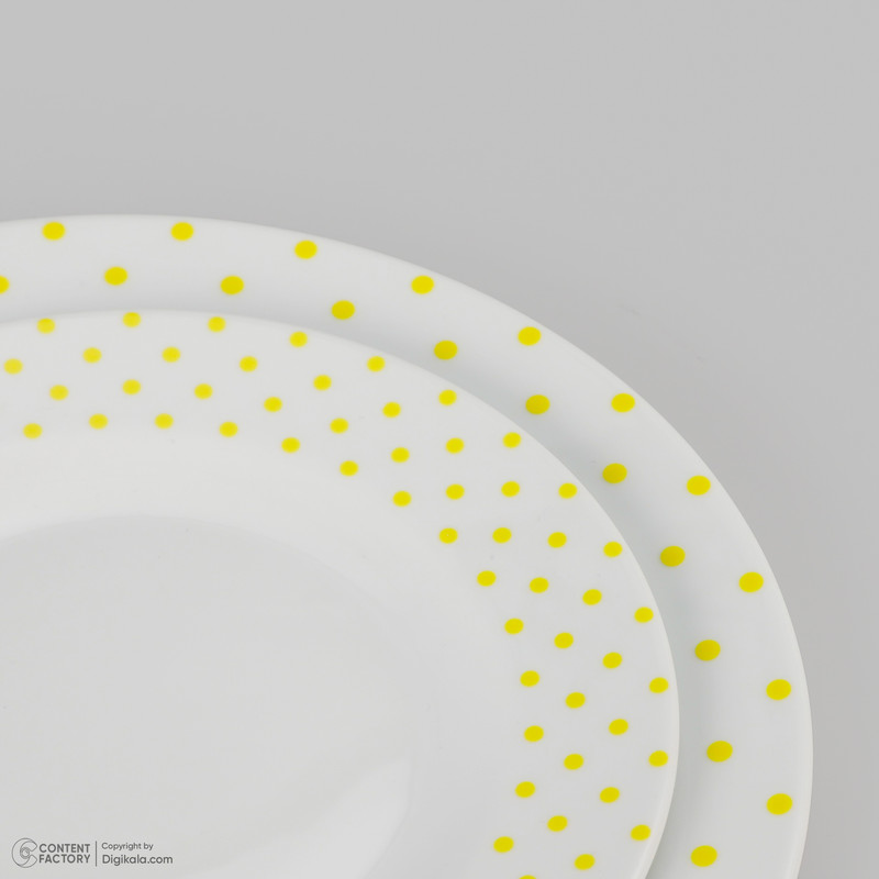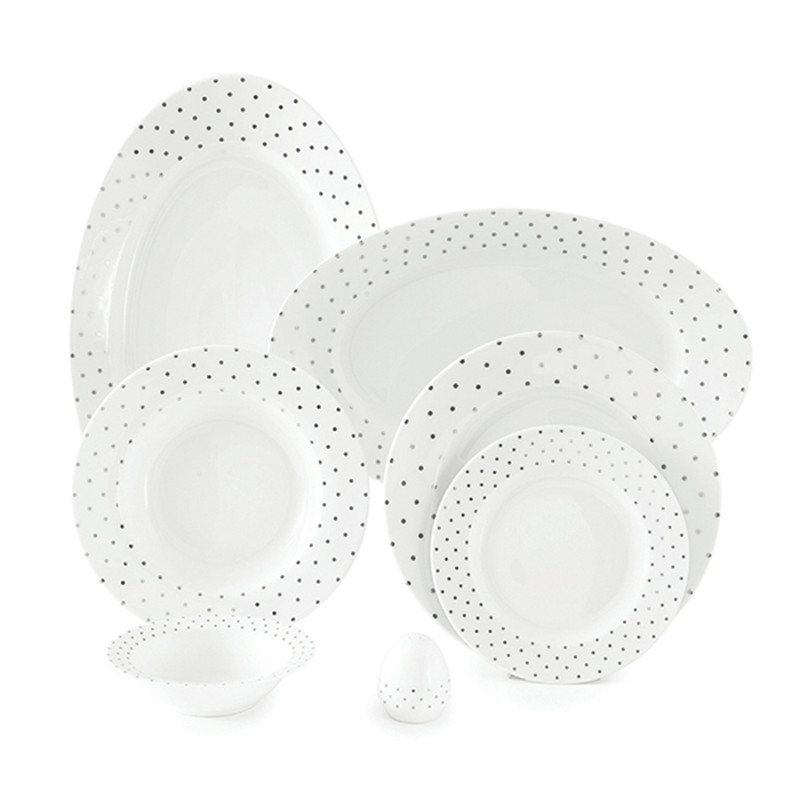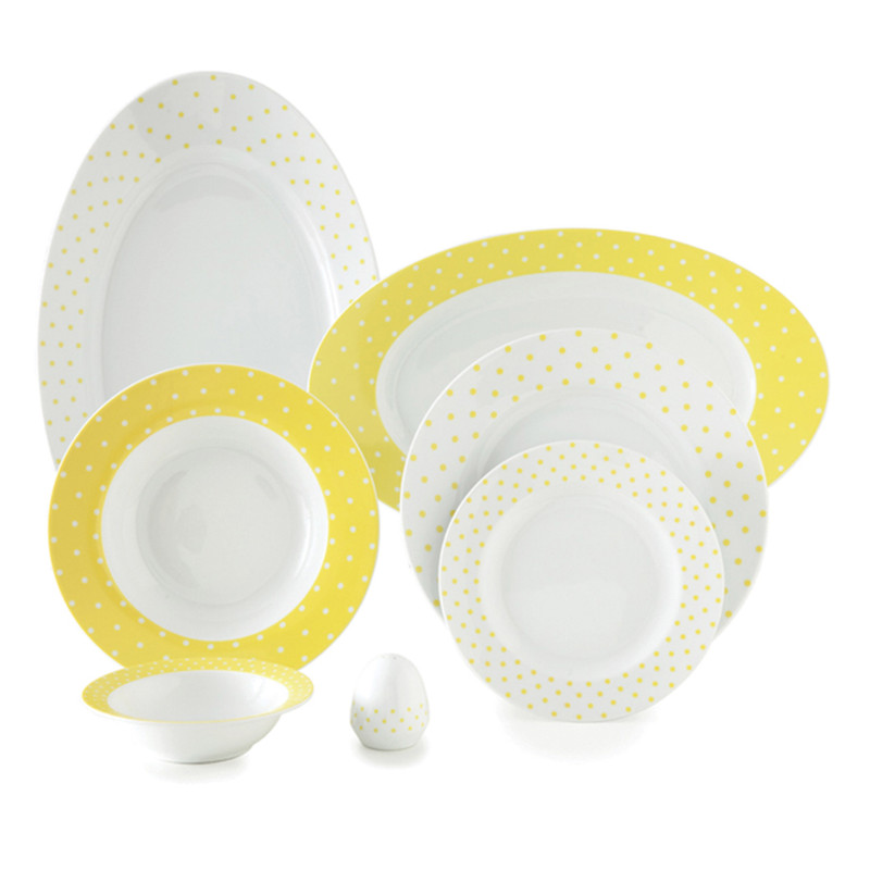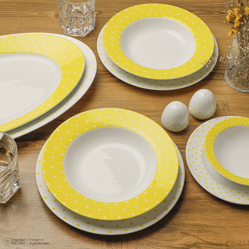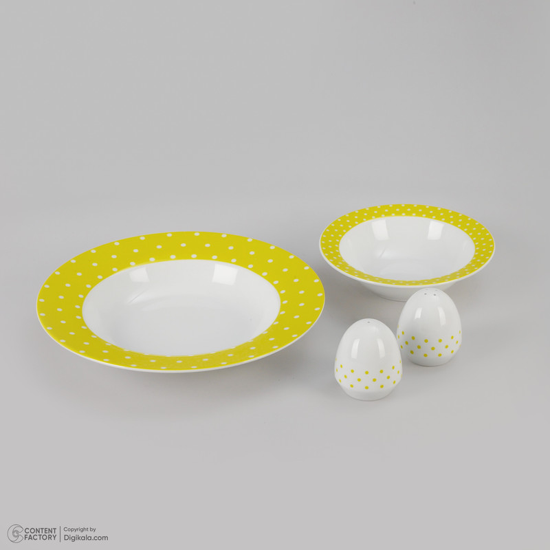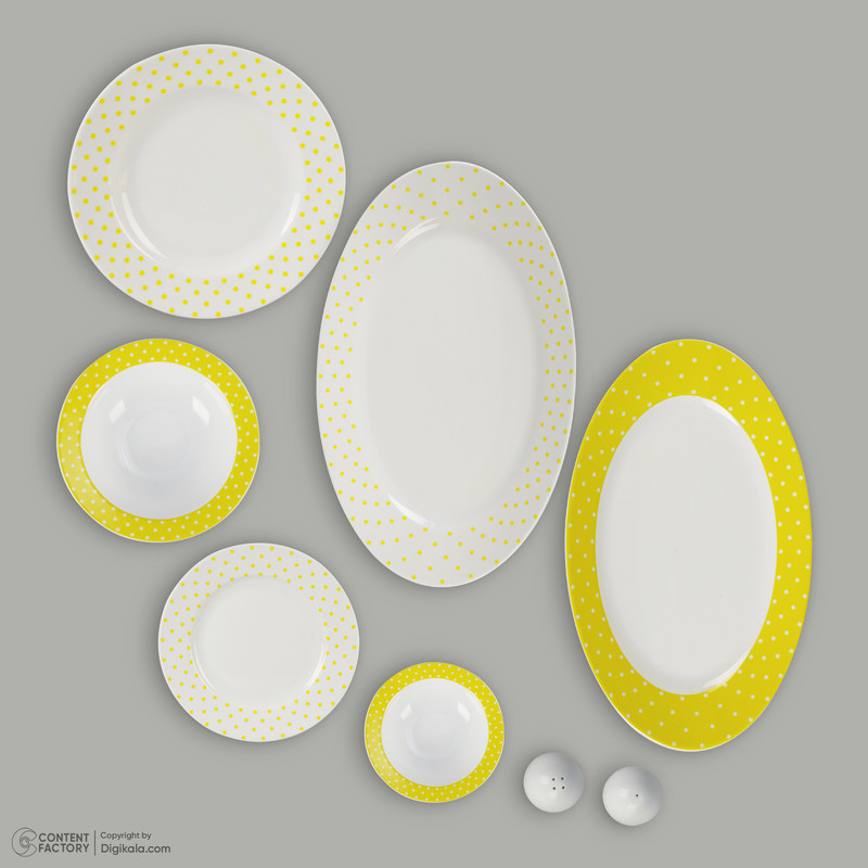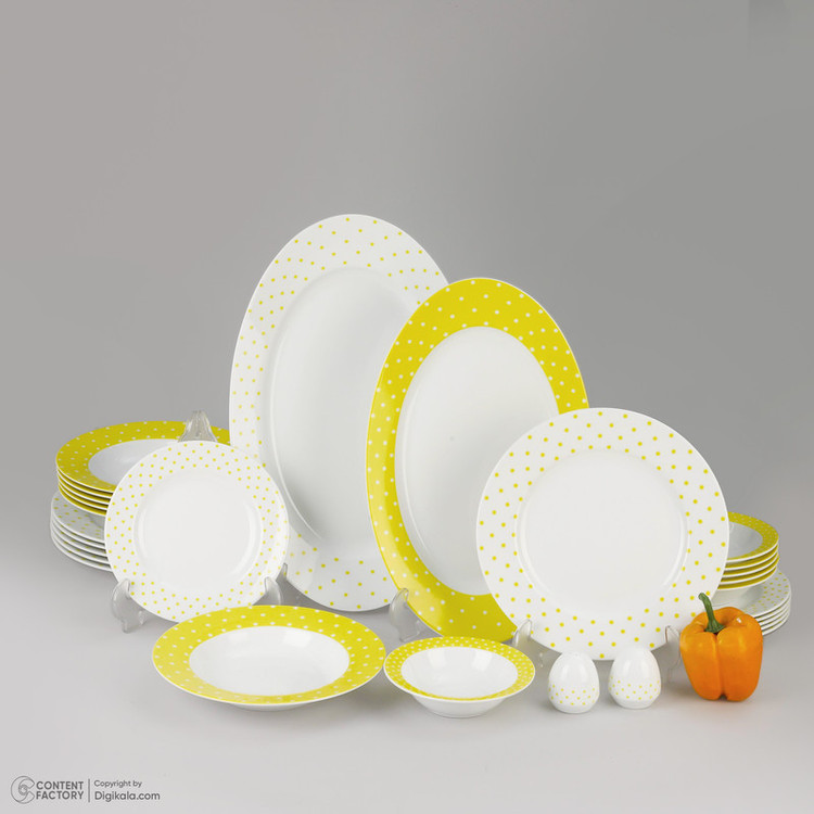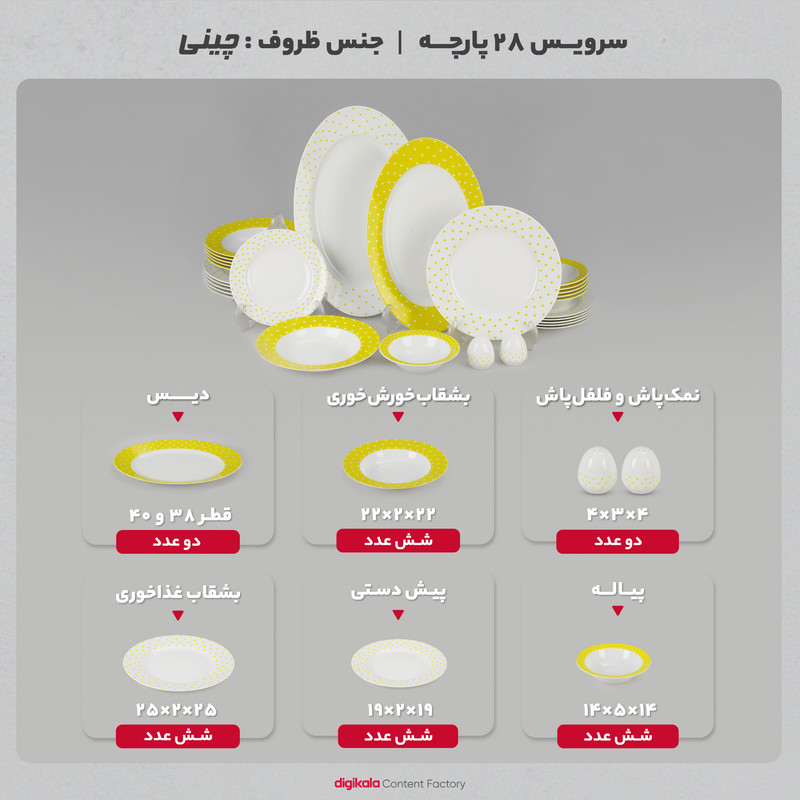 اقلام سرویس: دیس , بشقاب غذاخوری , بشقاب خورشخوری , پیشدستی , نمکپاش و فلفلپاش , پیاله