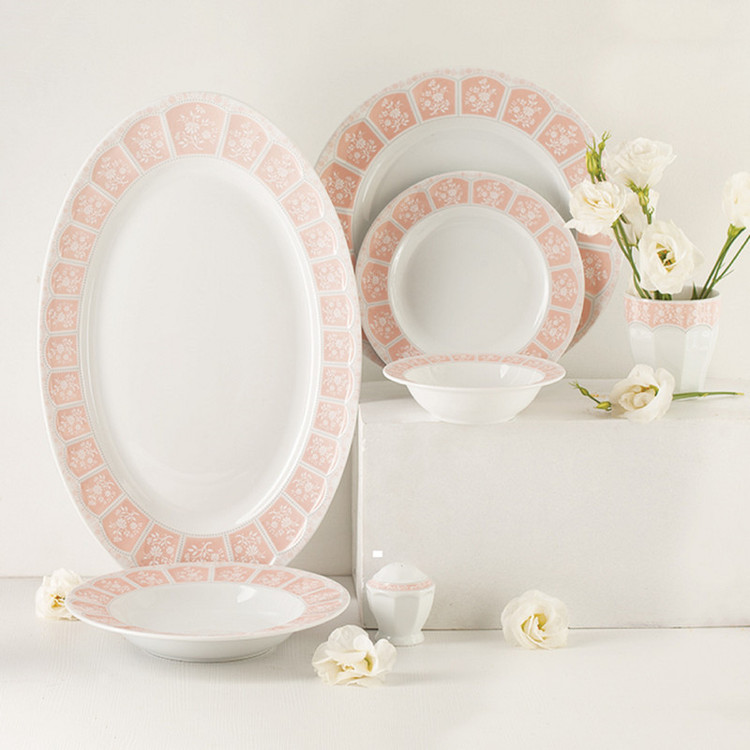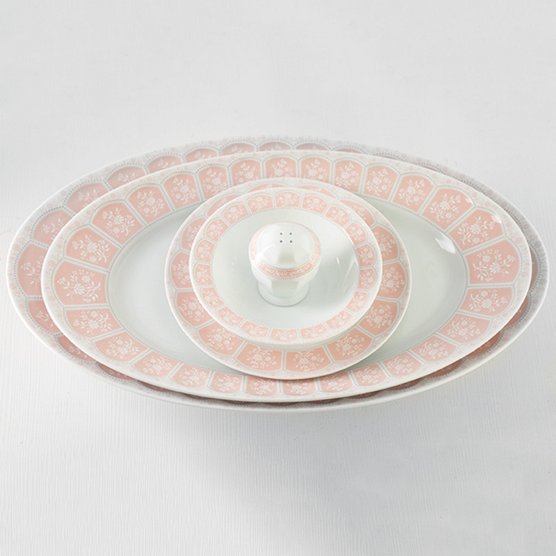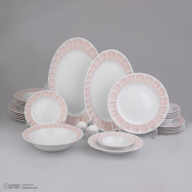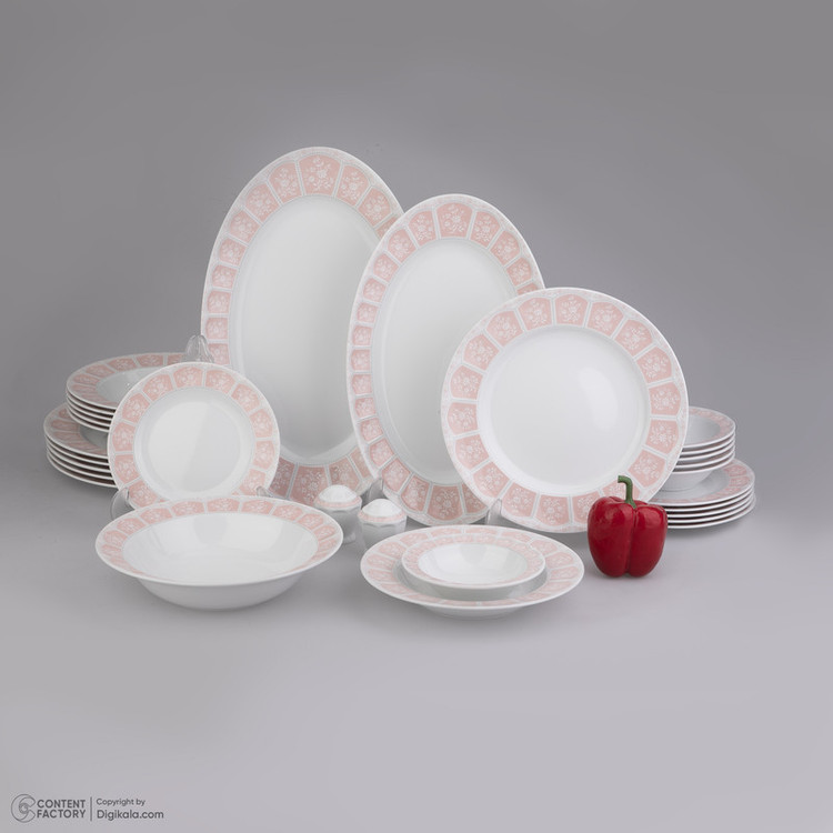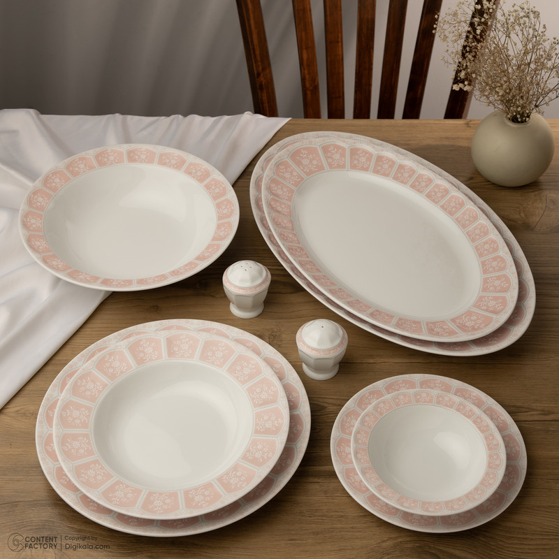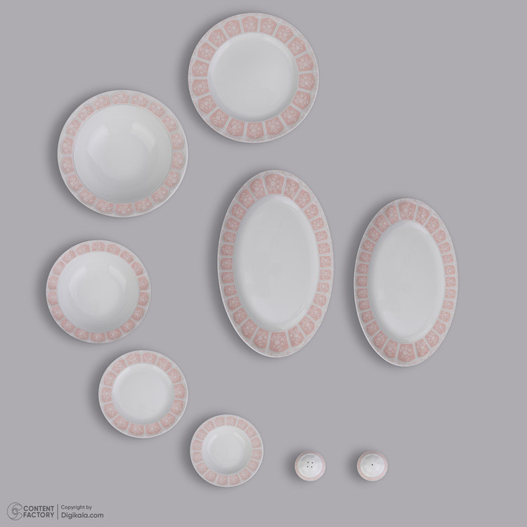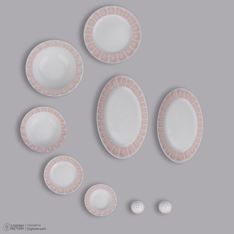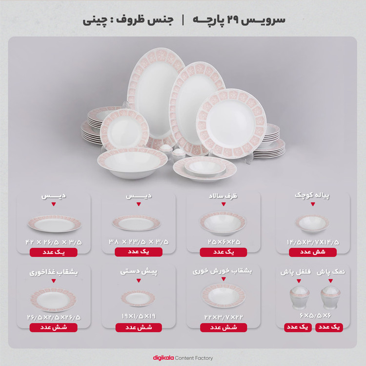 اقلام سرویس: ظرف سالاد , دیس , بشقاب غذاخوری , بشقاب خورشخوری , پیشدستی , نمکپاش و فلفلپاش , پیاله